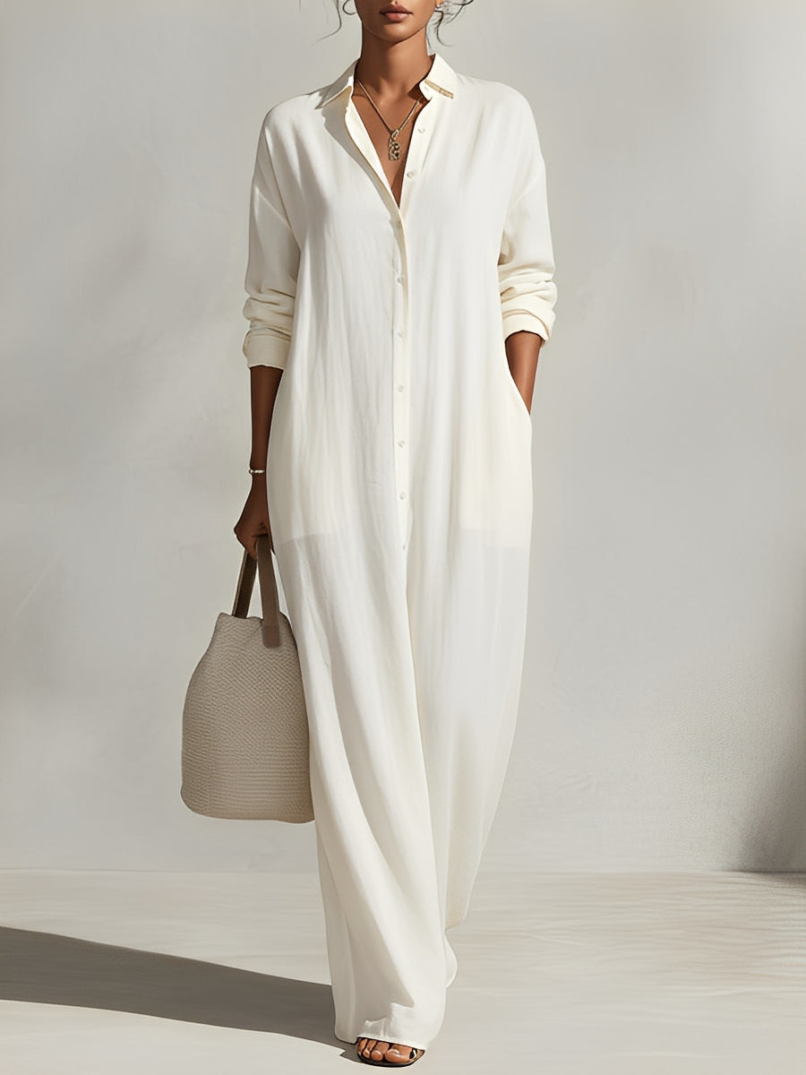Women's Elegant White Cotton-linen Blend Long-sleeved Shirt Dress MDA0833L5AN