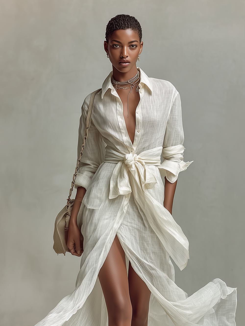 Women's Cream Textured Dress With Button-Front Detail & Relaxed Fit, Modern Casual-Chic Style Maxi Dress MDA1603L4I