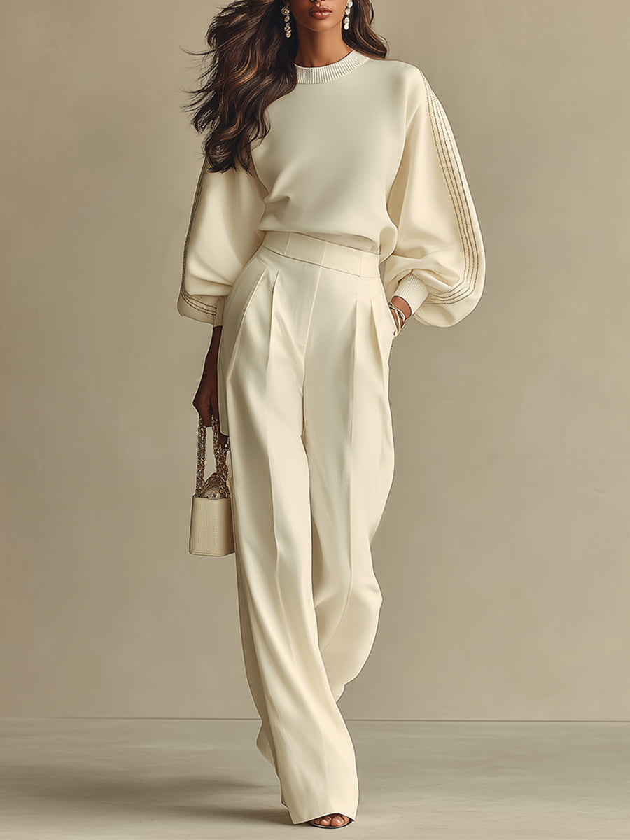 Women's Ivory Textured Set With Ribbed Crew Neck & High-Waisted Bottoms, Modern Sophisticated Style Set MDA2231L6I