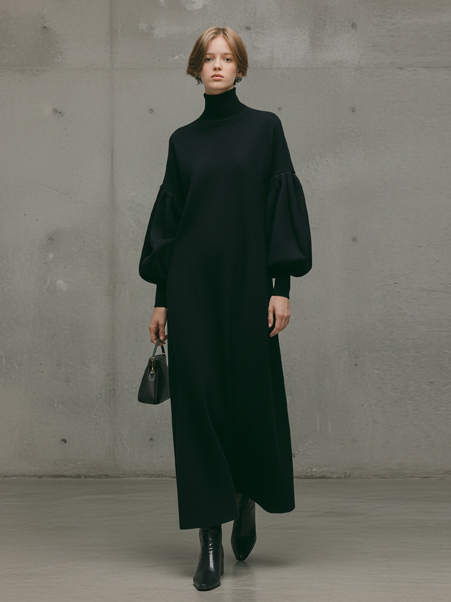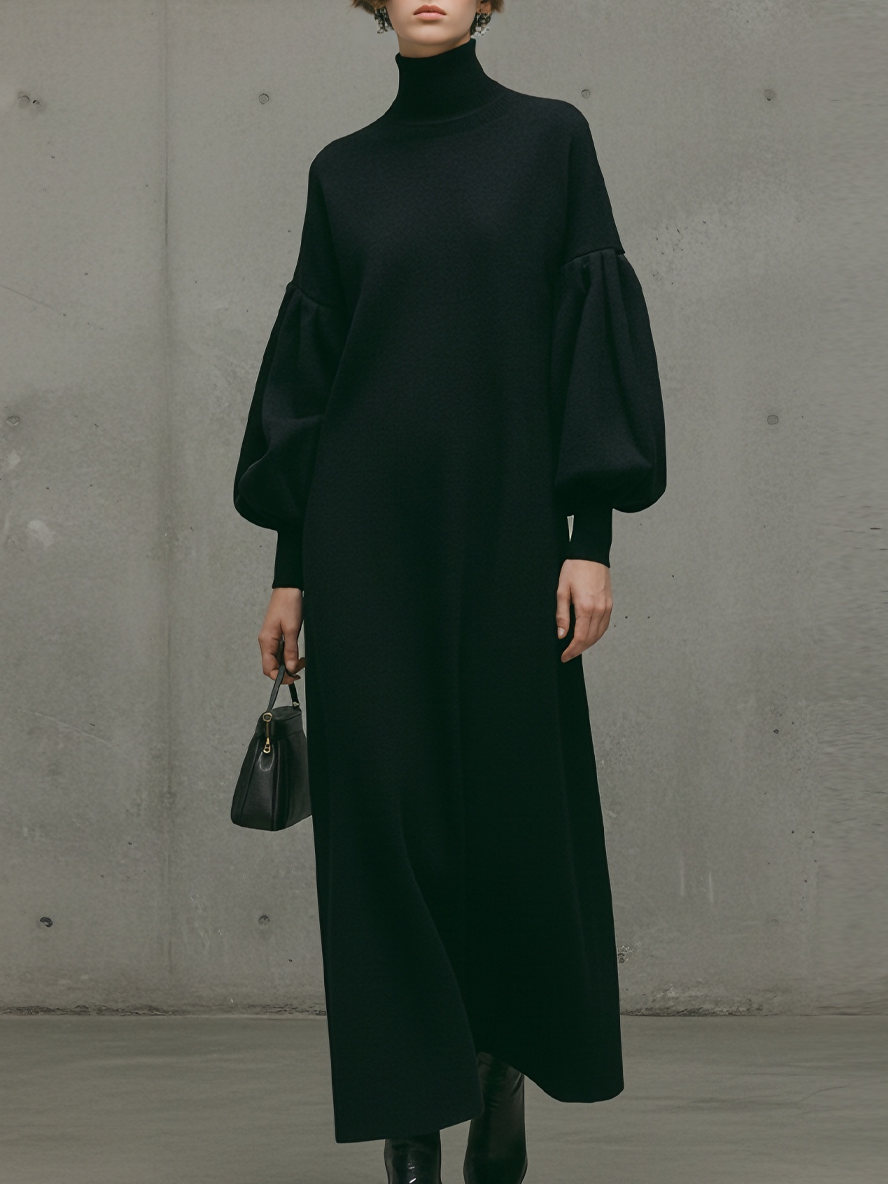 Women's Modern Black Turtleneck Puff-Sleeve Sweatshirt Maxi Dress MDA1503L6AU