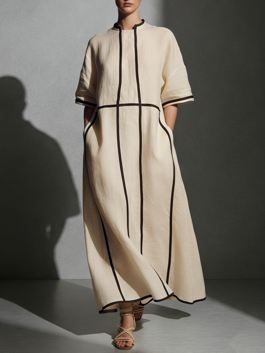Women's Modern Linen Blend Beige Stand-Collar Half-Sleeve Contrast-Line Pocketed Maxi Dress MDA2924L4AU