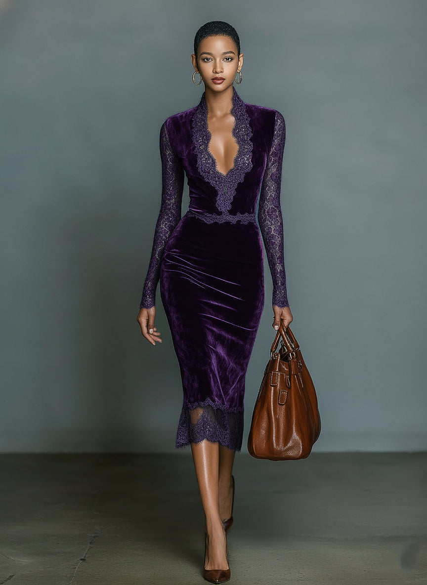 Women's Fashionable And Elegant Dark Blue Velvet Slim-fit V-neck Midi Dress With Lace Trim At The Neckline And Sleeves MDA2937K1AN